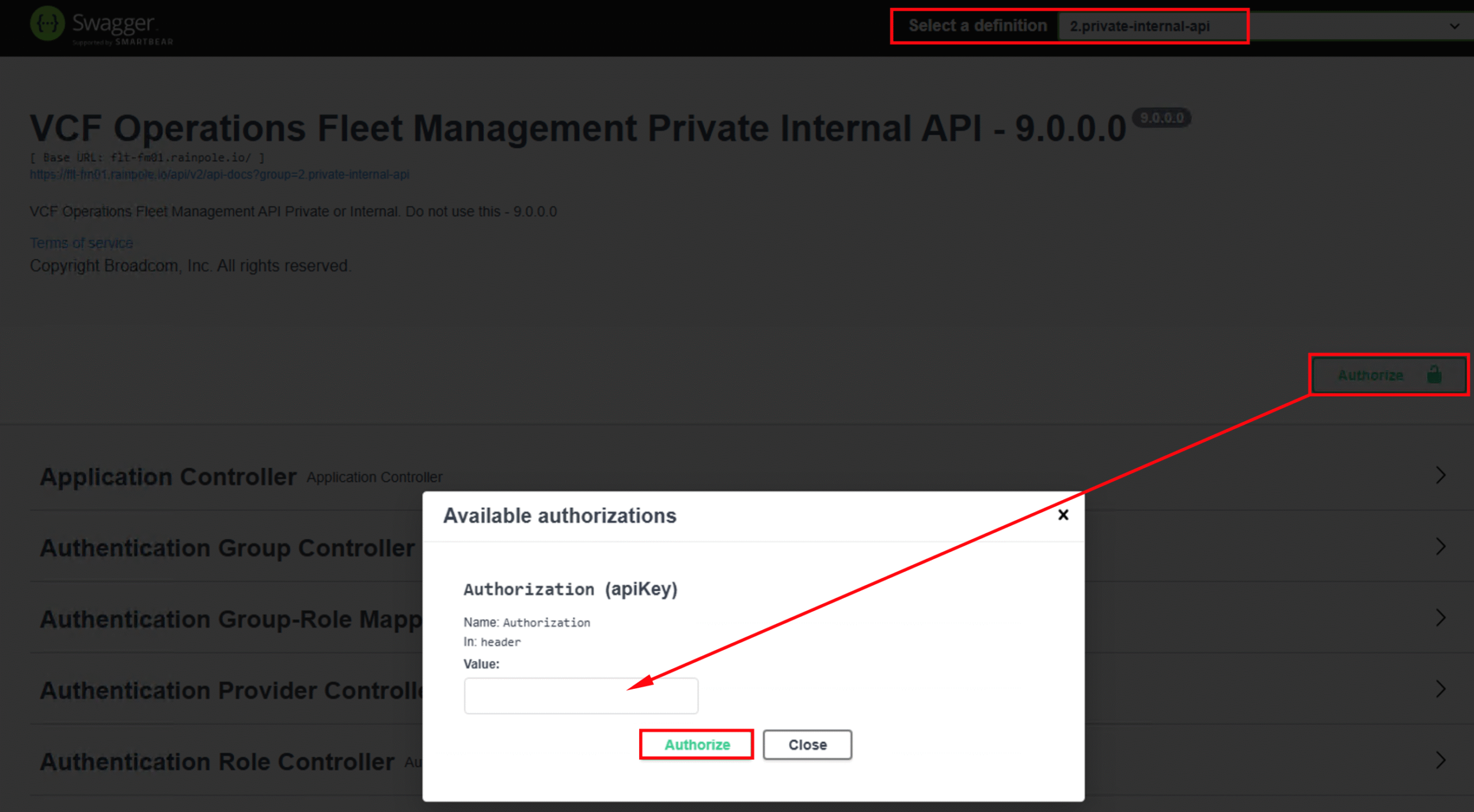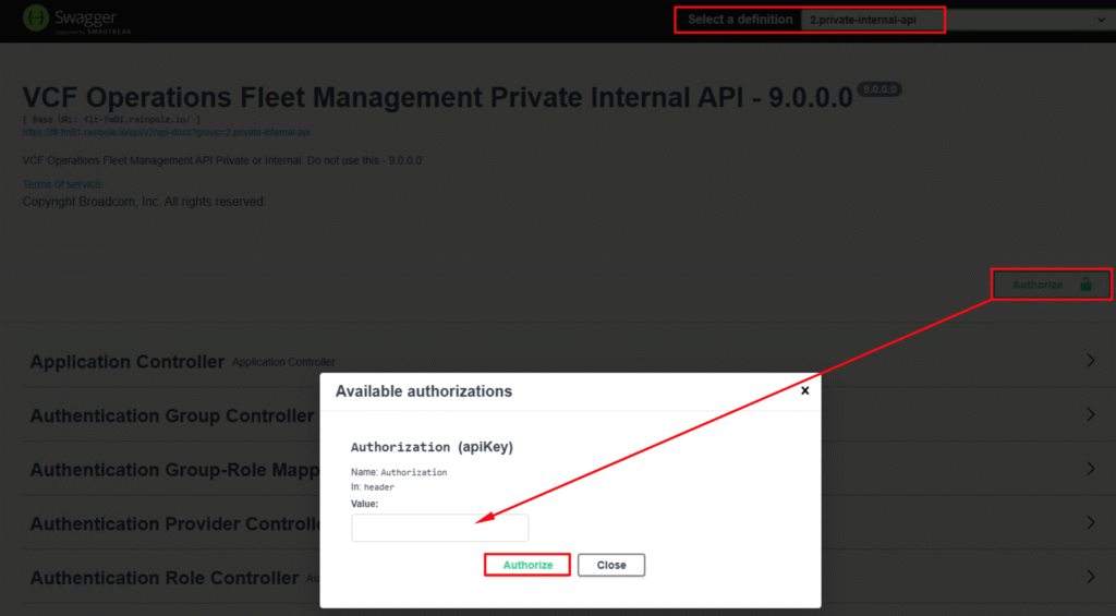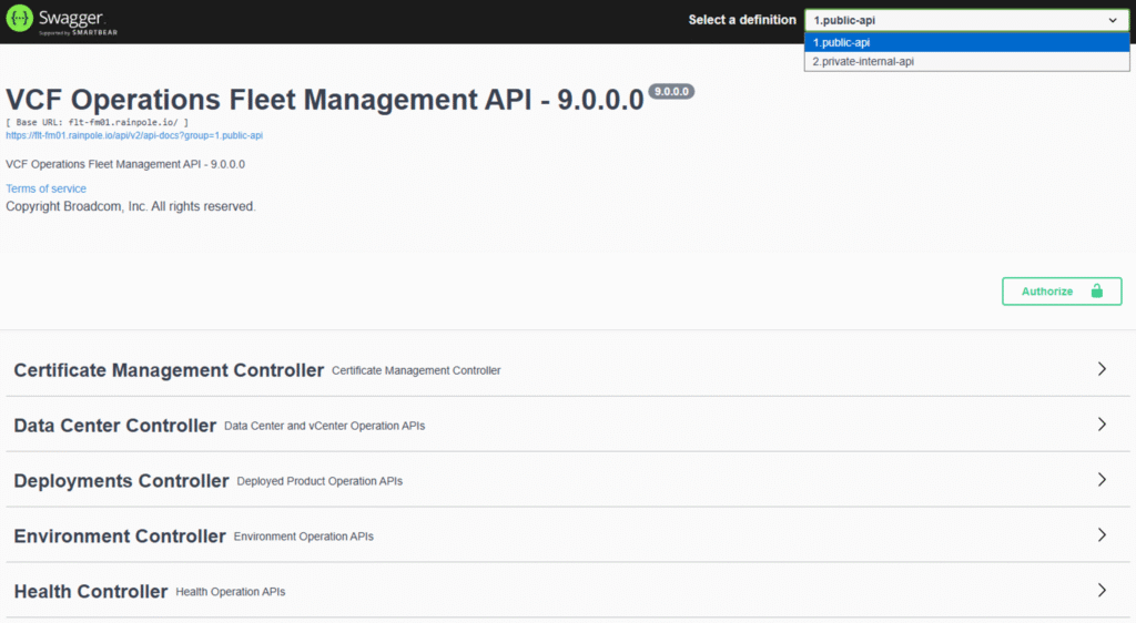 In the next screenshot we can see how to access the VCF Fleet Management Swagger UI.