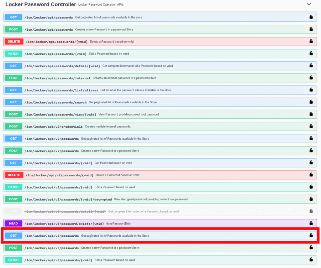 In my lab, as of this post, I’m running the brand new VCF 9.0.1 version. The REST call we’ll be using can be found in the v3 section of the Locker Password Controller. The next image shows the GET call.