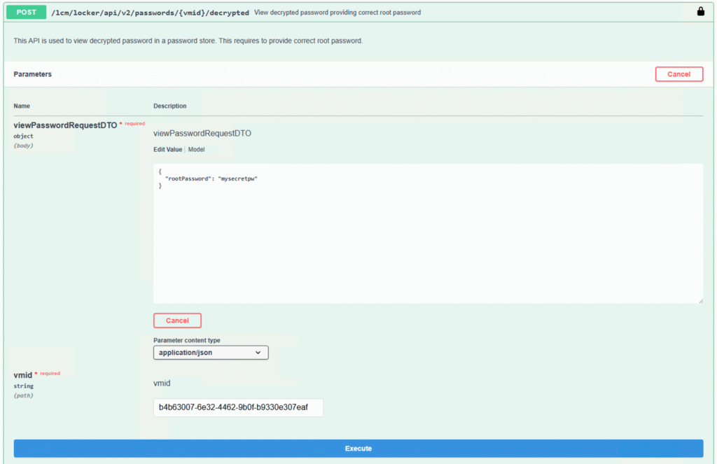 curl -X POST "https://flt-fm01.rainpole.io/lcm/locker/api/v2/passwords/b4b63007-6e32-4462-9b0f-b9330e307eaf/decrypted" -H "accept: application/json" -H "Authorization: Basic YWRtaW5AbG9jYWw6Vk13QHJlMSFWTXdAcmUxIQ==" -H "Content-Type: application/json" -d "{ \"rootPassword\": \"mysecretpw\"}"