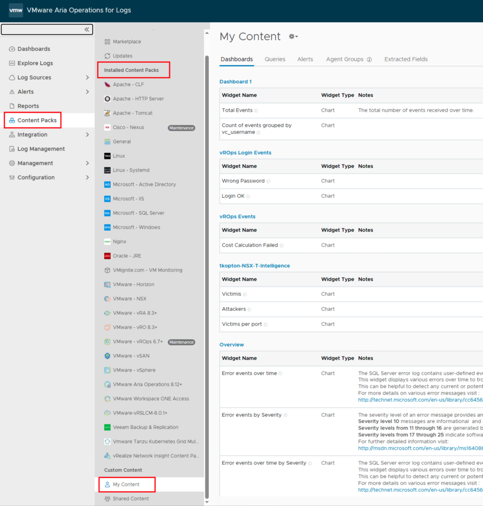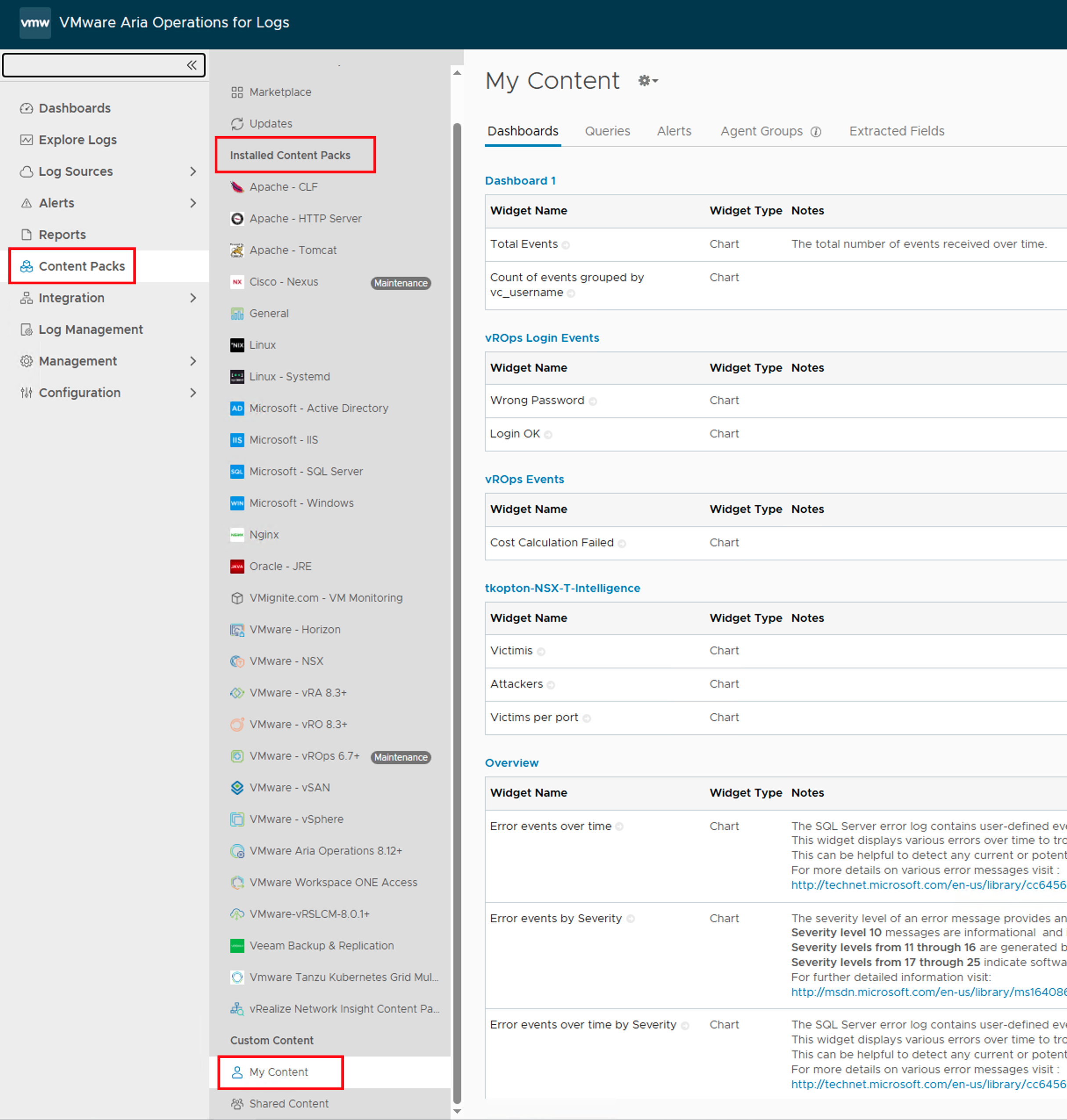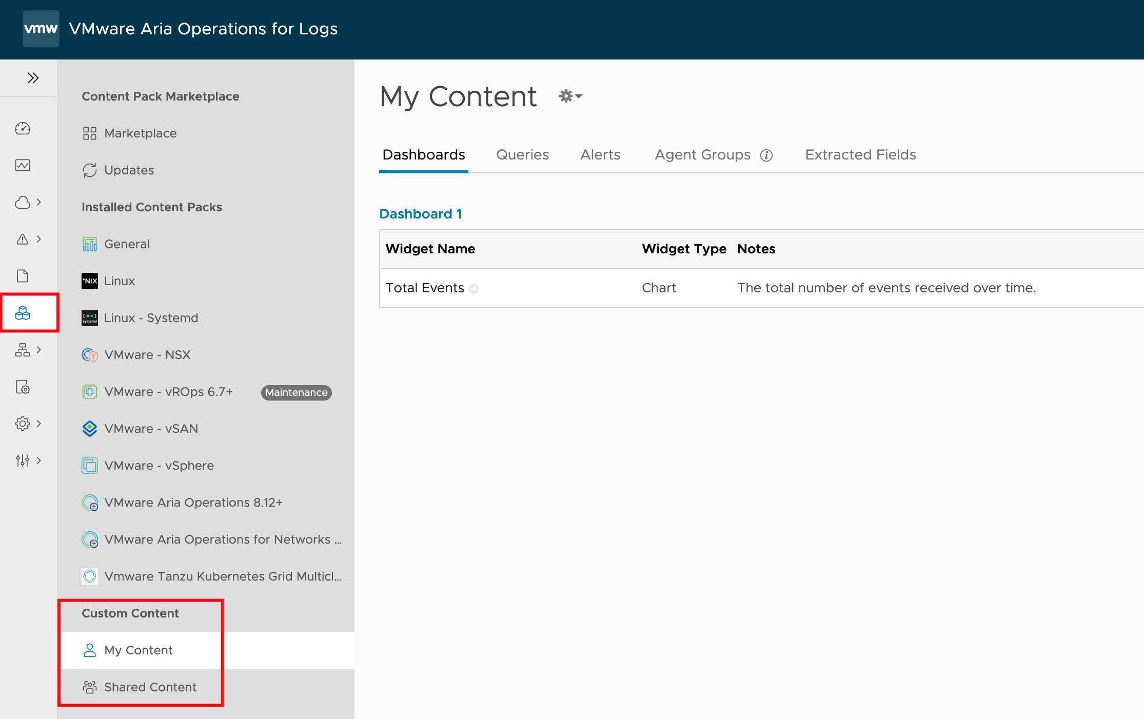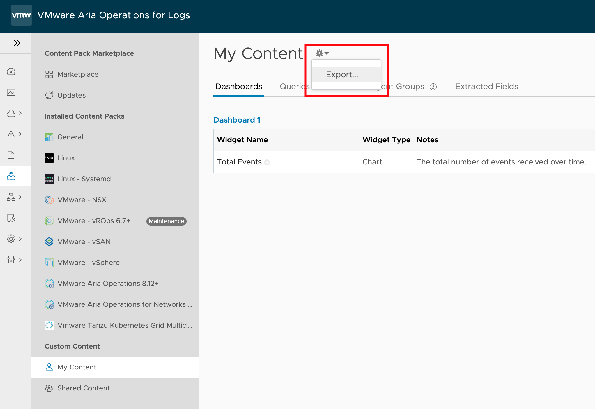 One of the most efficient ways to migrate bulk content is to treat your custom work as if it were a third-party application. In Aria Operations for Logs, Content Packs are essentially containers designed to package logic and visualizations for portability. While we typically associate them with vendors (e.g., the vSphere Content Pack), you can create your own private Content Packs to bundle your environment’s custom artifacts into a single, portable .vlcp file.