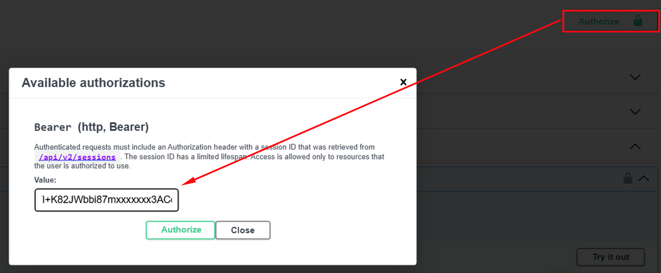 The authorization using the retrieved token starts by clicking on the corresponding button in the UI and submitting the access token in the Bearer input field as value as shown in the next screenshot.