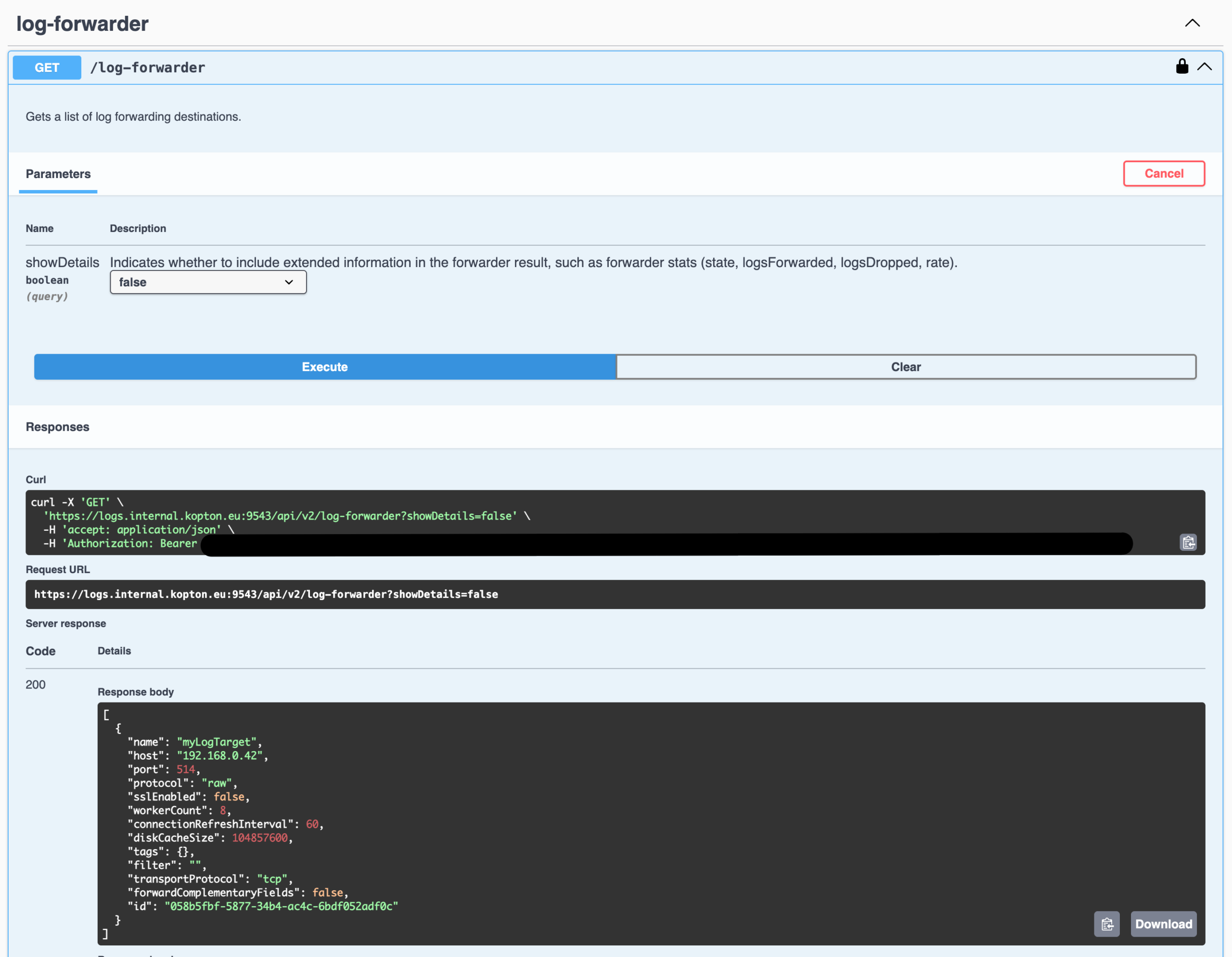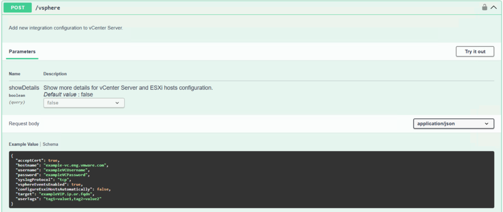 A simple GET request to https://$logsfqdn:9543/api/v2/vsphere—please note the specific TCP port where the API is reachable—is all we need to retrieve information about the configured vSphere endpoints.