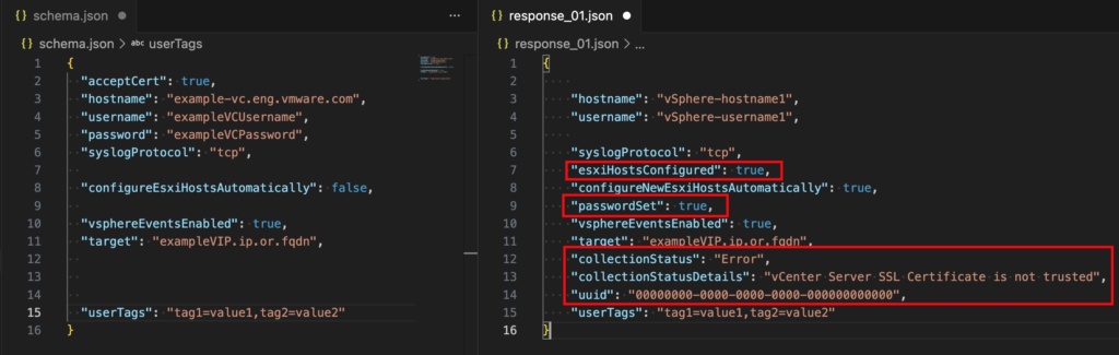 This is the JSON Body schema and one of the vSphere endpoints we received in the response in comparison.