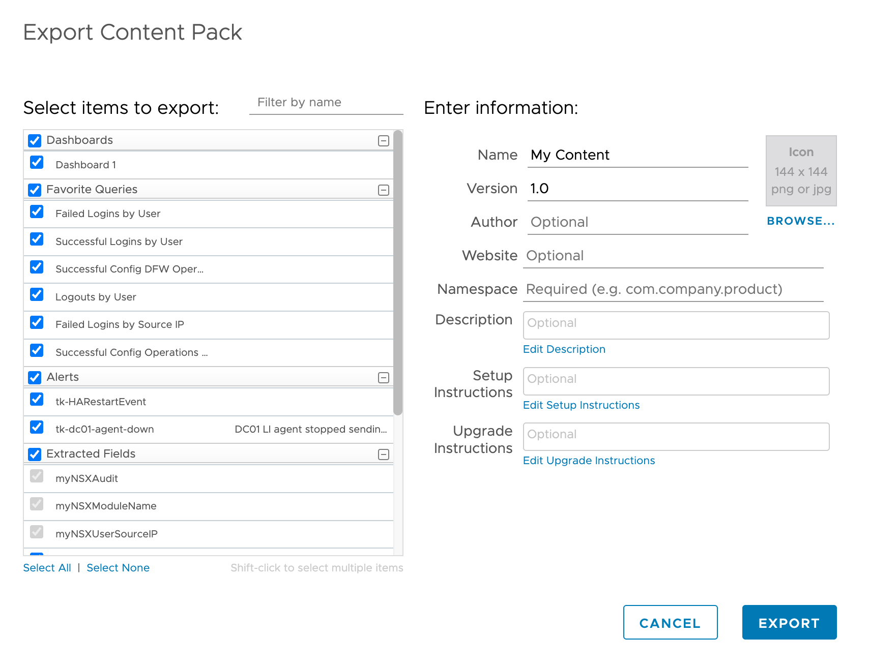 - Select the items you want to add to the content pack and export. Enter the required information like Name, Version and Namespace. Click Export.