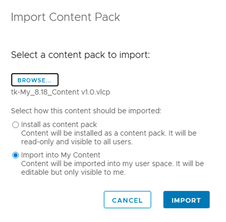 - Behavior: This imports the content as a read-only “installed” pack, visible to all users immediately.